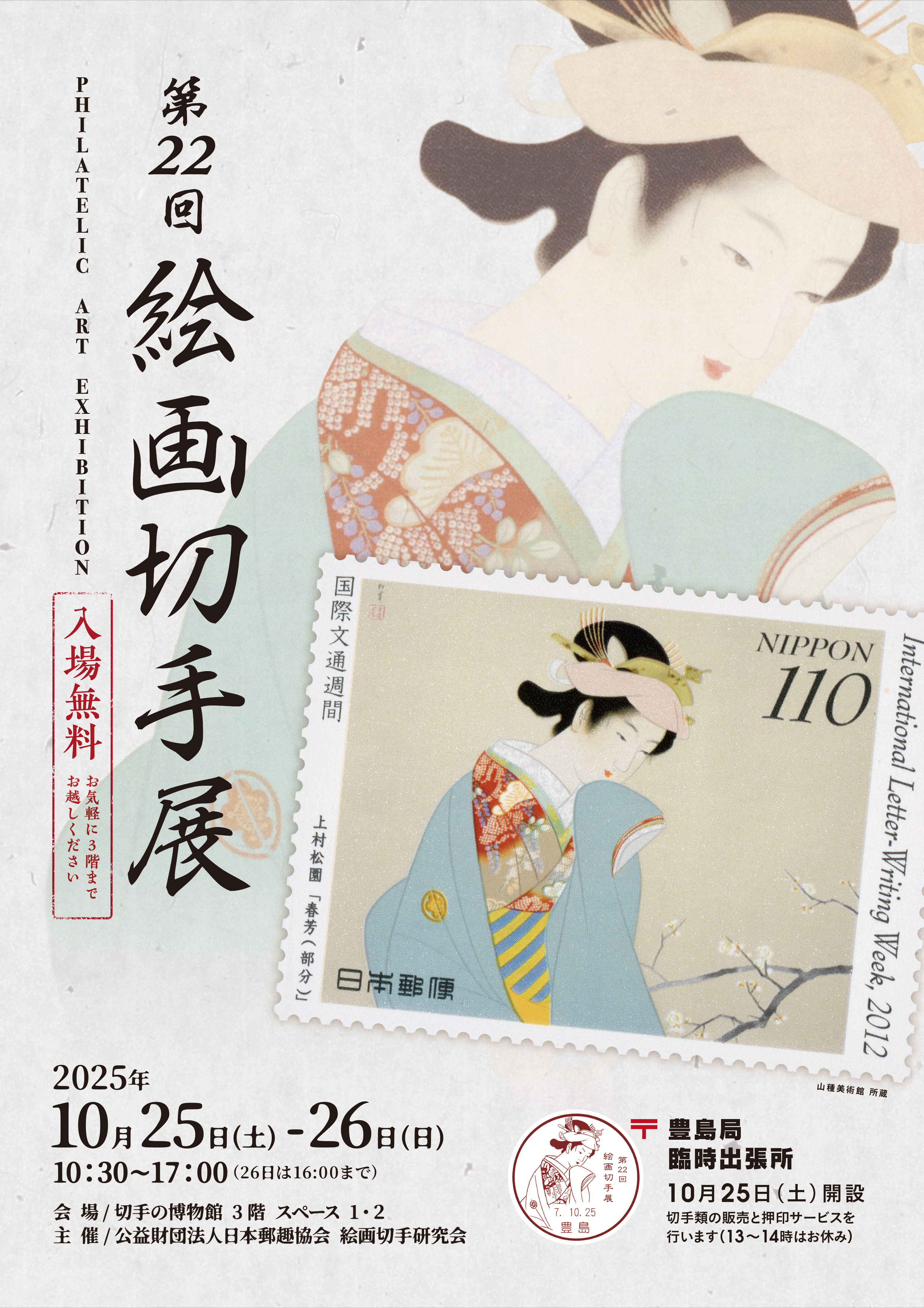 小型印のテーマは毎回、切手になった絵画に描かれた女性から選んでいますが、今年は上村松園画「春芳」(1940年制作)(2012年「国際文通週間」にて発行)です。 | パンフレットはこちら |
