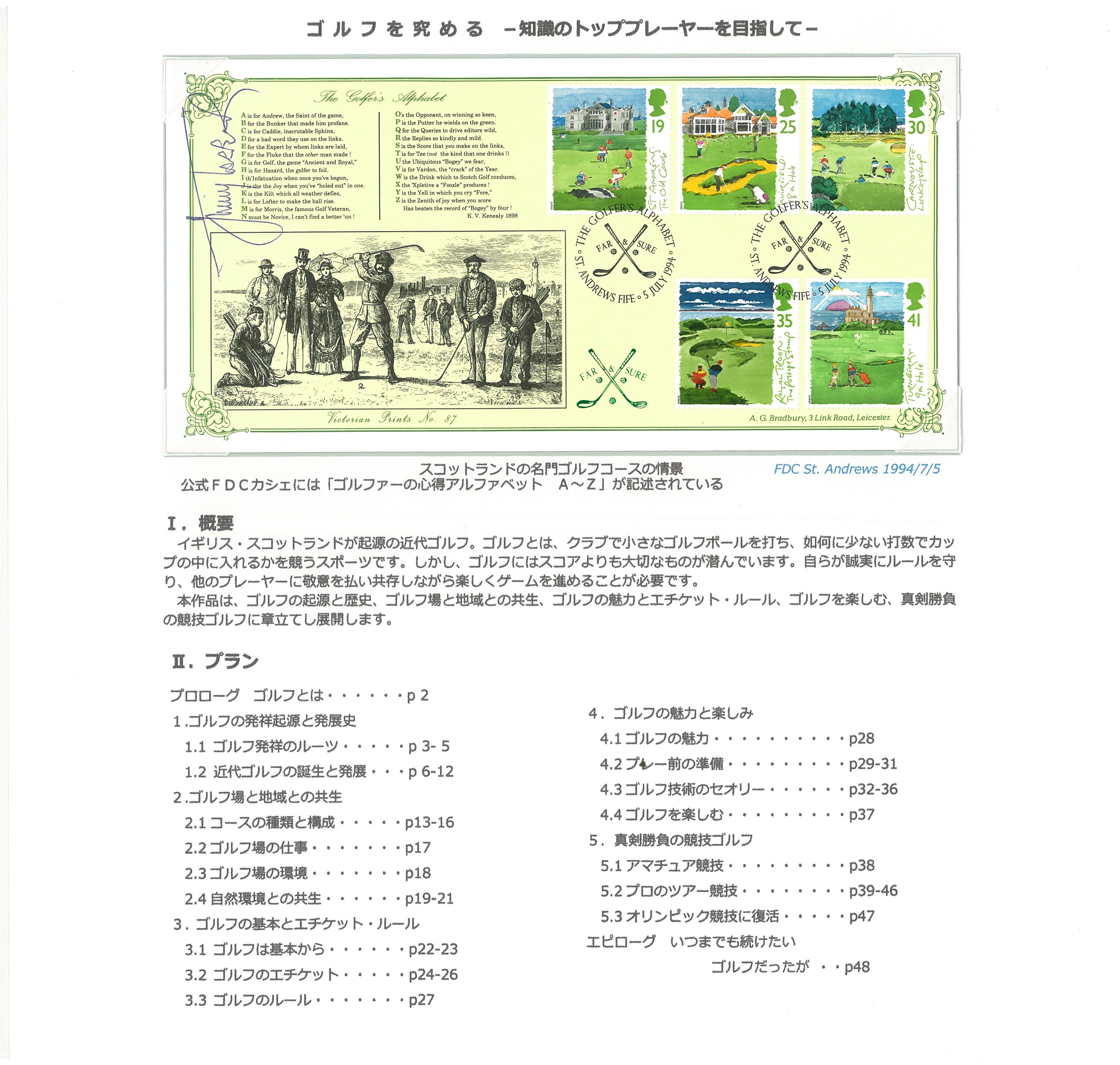 | ギリス・スコットランドが起源の近代ゴルフ。ゴルフとは、クラブで小さなゴルフボールを打ち、如何に少ない打数でカップの中に入れるかを競うスポーツです。しかし、ゴルフにはスコアよりも大切なものが潜んでいます。自らが誠実にルールを守り、他のプレーヤーに敬意を払い共存しながら楽しくゲームを進めることが必要です。 本作品は、ゴルフの起源と歴史、ゴルフ場と地域との共生、ゴルフの魅力とエチケット・ルール、ゴルフを楽しむ、真剣勝負の競技ゴルフに章立てし展開します。 |